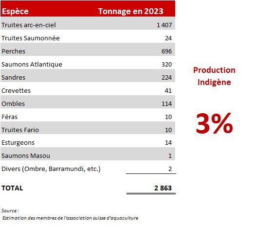 L’aquaculture suisse représentait en 2023 une production d’environ 2’900 tonnes de poissons et de crustacés (Estimation de l’association par interview des membres) alors que la consommation helvétique se montait à quelques 78’000 tonnes (FAO 2019, WWF 2024).